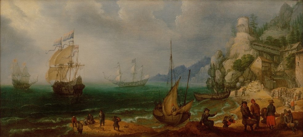 Adam Willarts, Felsige Küstenlandschaft mit Segelschiffen und Fischern (Fischer,Fischerei,Küste,Kunst,Landschaft,Schiff,Segelschiff,Fischerboot,Meer,Barock,Marinemalerei,Felsen,Niederländische Kunst,Fischhandel,Steilküste,Schifffahrt)