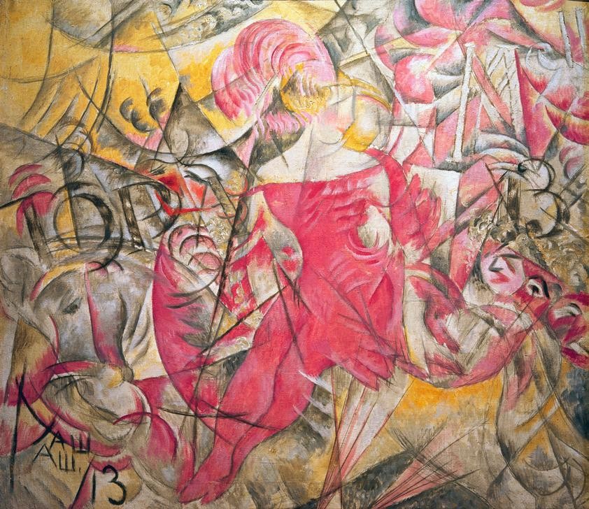 Alexander Wassiljewitsch Schewtschenko, Der Zirkus (Beruf,Fahrendes Volk,Frau,Gesellschaft,Kunst,Pferd (Tier),Schriftzeichen,Zirkus (Theater),Kubismus,Futurismus,Russische Kunst,Reiterin,Frau Und Tier,Tier,Kubofuturismus,Rosa (Farbe),Zirkusreiterin,Schrift,Kyrillische Schrift,Farbe)