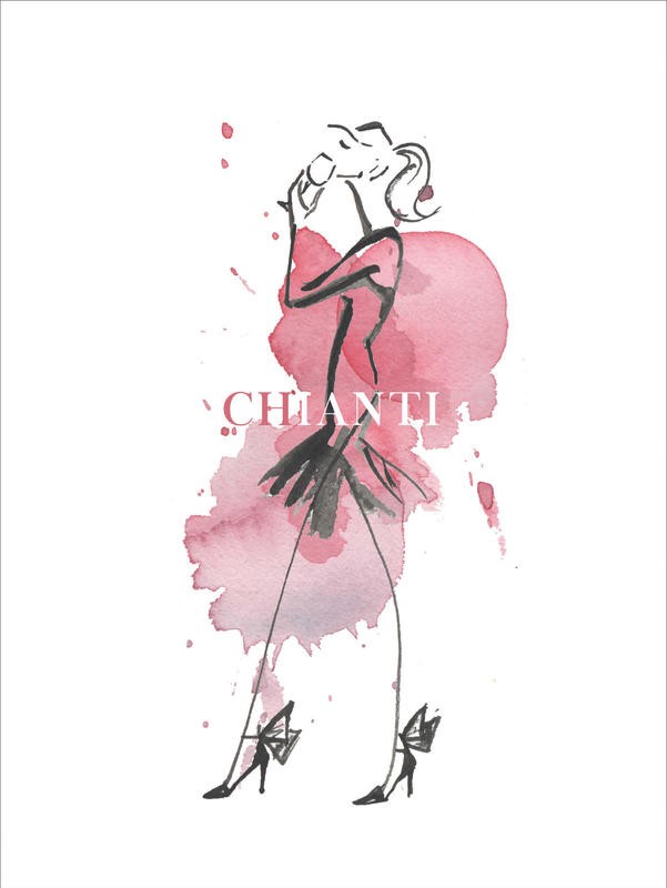 Alicia Zyburt, FASHION IN ROSE I (Frau, Eleganz, Party, Weinglas, Chianti, Mode, Aquarell, modern, skizziert, Wohnzimmer, Wunschgröße, rosa/schwarz)