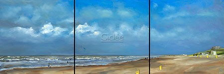 Ans Smits, Beach north triptych (Strand, Meer, Sand, Horizont, menschenleer, Wolken, Weite, Fernweh, Triptychon, impressionistisch, Malerei, modern, Wohnzimmer, Treppenhaus, bunt)