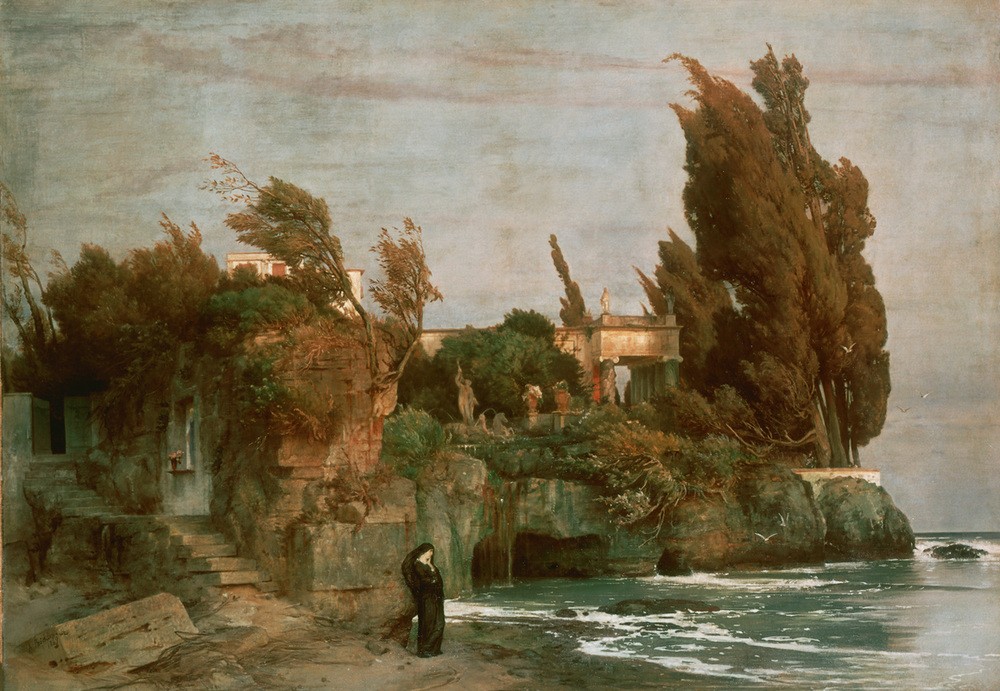 Arnold Böcklin, Villa am Meer (Landschaft, Meer, Küste, Klippen, Haus, Menschen, Frau, Wartende, Sturm, Wind,  Symbolismus, Wunschgröße, Klassiker, Wohnzimmer, bunt)