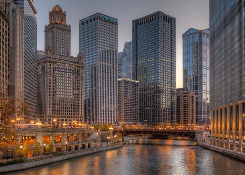 Aurélien Terrible, Peaceful Chicago (Wunschgröße, Fotografie, Städte, Metropole, Chicago, Skyline, Hochhäuser, Wolkenkratzer, moderne Architektur, Abendszene, Wohnzimmer, Büro, bunt)