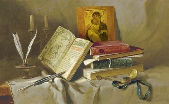 Igor Belkovskij, OLD BOOKS I (Stillleben, alte Bücher, Schreibutensilien Feder, Ikone, Kerzenhalter, Taschenuhr, Nostalgie, Bibliothek, Wohnzimmer, Arbeitszimmer, Treppenhaus, Malerei, bunt)
