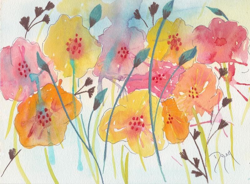Beverly Dyer, Spring Party I (Blüten, Blumen, Frühling, verspielt, Grafik, Wohnzimmer, Treppenhaus, Malerei, Wunschgröße, bunt)