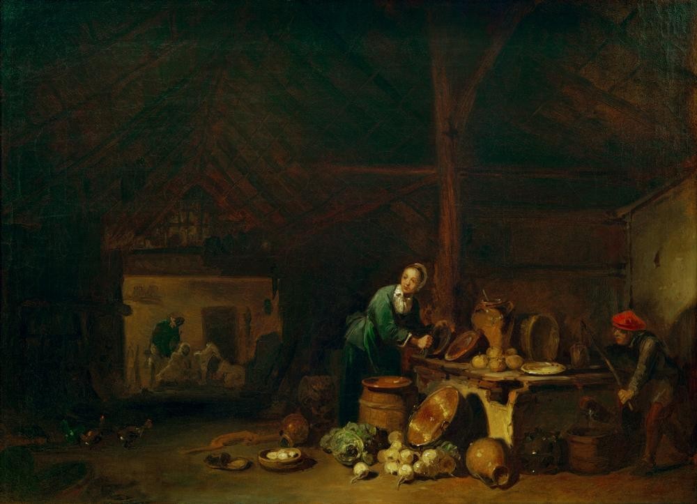 Carl Spitzweg, Kücheninterieur (Deutsche Kunst,Dienstboten,Frau,Hausarbeit,Küche,Kunst,Wohnung,Hausfrau,Abwasch,Interieur,Kopie,Genre,Niederländische Kunst,Köchin,Küchenmagd,Frauenleben)