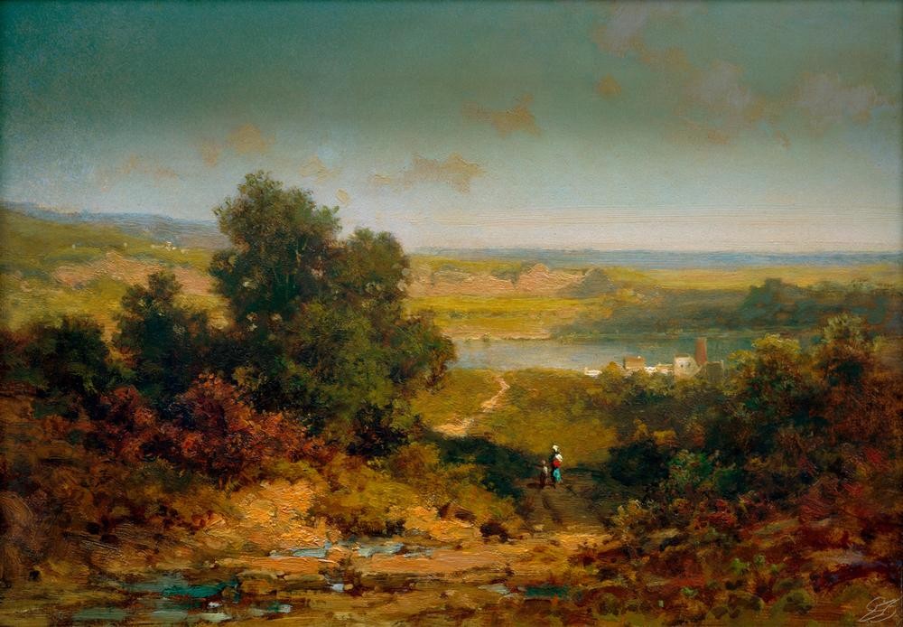 Deutsche Kunst - Dorf - Kunst - Landschaft - Fluss - Baum - Ebene