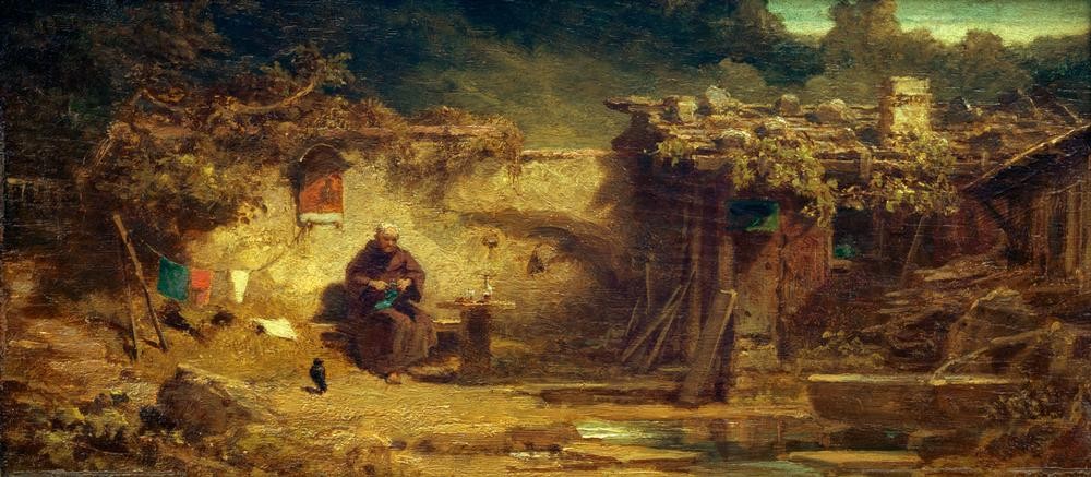 Carl Spitzweg, Strickender Einsiedler (Deutsche Kunst,Hausarbeit,Katholische Kirche,Kirche,Kunst,Mann,Religion,Stricken,Biedermeier,Mönch,Eremit,Einsamkeit,Genre,Einsiedelei,Hausmann,Männerleben,Alleinstehender)