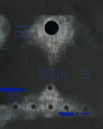 Carole Bécam, Nomada - Diptyque II (Abstrakte Malerei, Linien, Punkte,blaue Horizontale, filigran,  Business, Büro, Wohnzimmer, zeitgenössisch, blau/grau, schwarz, Wunschgröße)