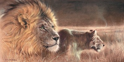 Renato Casaro, She has a job (Natur, Afrika,  Tier, Raubkatze, Löwe, Löwin, Jagd, Mähne, Wohnzimmer, Kunst, Modern, Malerei, Fotorealismus,  bunt)