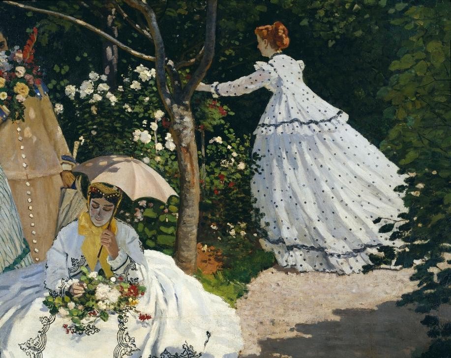 Claude Monet, Femmes au jardin (Botanik,Damenmode,Frau,Garten Und Park,Jahreszeiten,Jugend (Lebensalter),Menschen Im Park,Mode,Freizeit,Sommer,Impressionismus,Schatten,Portrait,Baum,Sonnenschirm,Blumenstrauss,Bürgertum,Französische Kunst,Licht,Riechen,Sinne,Kleid,Rote Haare,Harmonie,Syn)