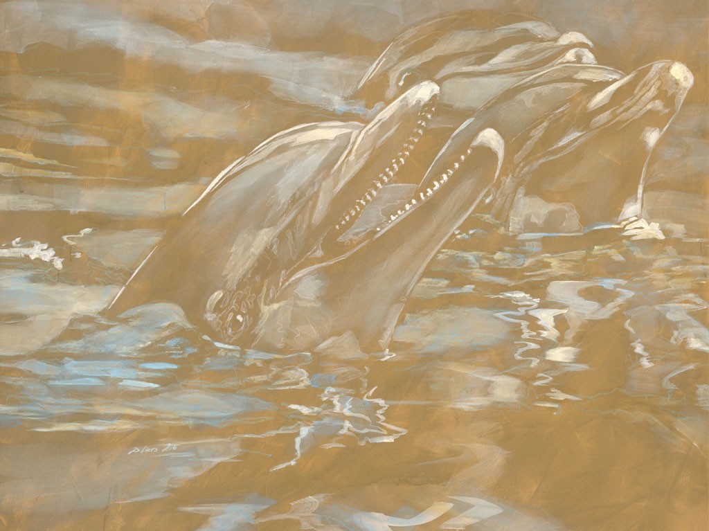 Daniela Lüers, Delfine (Delphine, Meeresäuger, Meerestiere, modern, zeitgenössische Malerei, Treppenhaus, Wohnzimmer, Badezimmer, gold/grau)