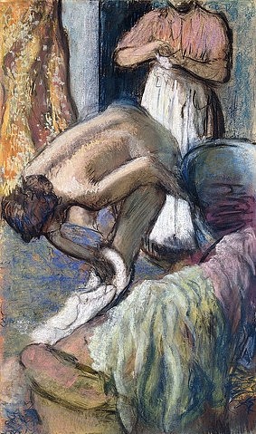Edgar Degas, Frühstück nach dem Bad (Junge Frau beim Abtrocknen). / Le Petit-Déjeuner après le Bain (Jeune Femme s'essuyant). Um 1894 (Pastell/Kreide auf Papier,Impressionismus,19. Jahrhundert,Christie's Images Ltd,1834-1917,Degas,Edgar,Edgar Degas,1894,Baden,nach vorne beugen,lehnen,Frühstück,Akt,Frau,Dienerin,Pastell,Handtuch,Frauen,Körperpflege,intim,sich abtrocknen, französischer imp)
