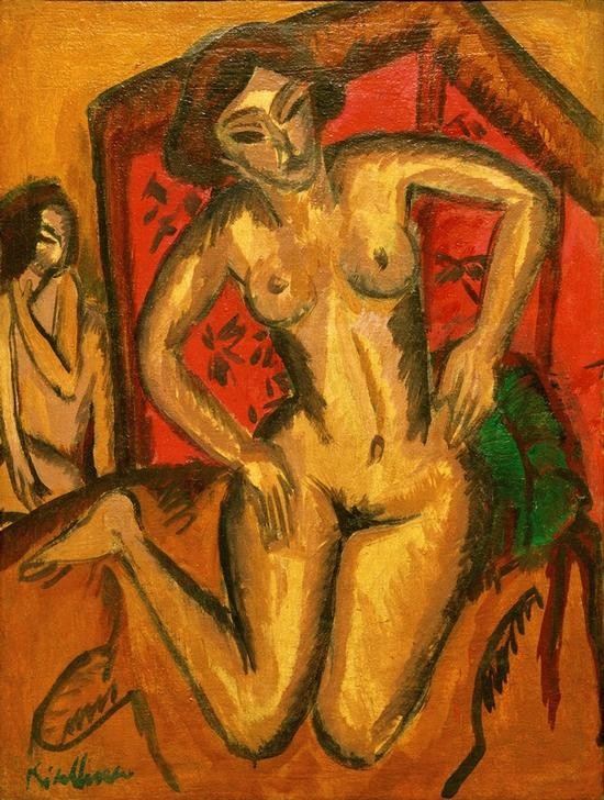 Ernst Ludwig Kirchner, Kniender Mädchenakt vor rotem Wandschirm (Deutsche Kunst,Frau,Kunst,Akt,Expressionismus,Paravent,Die Brücke,Exotik,Junge Frau,Knien,Primitivismus,Körperhaltung,Signatur)