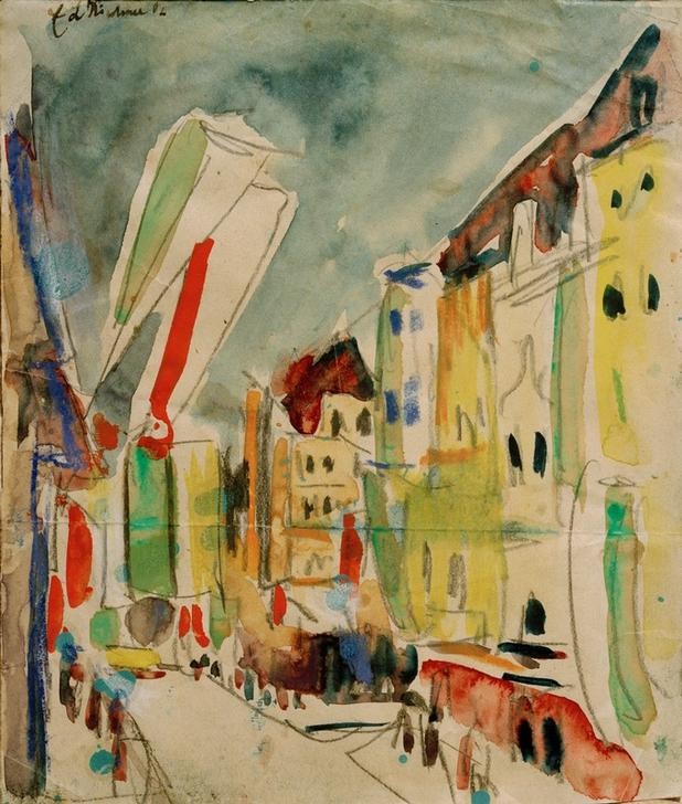 Ernst Ludwig Kirchner, Straßenszene mit Fahnen (Architektur,Deutsche Kunst,Kunst,Strasse (Allgemein),Strassenszene,Wohnhaus (Allgemein),Expressionismus,Architekturdarstellung,Die Brücke,Jahrhundertwende,Fahne)