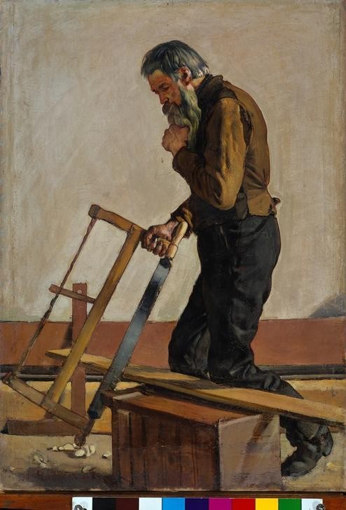 Ferdinand Hodler, Der philosphierende Arbeiter (Arbeiter,Arbeit,Handwerk Und Gewerbe,Sage,Kunst,Philosoph,Zimmermann,Philosophie,Werkzeug,Realismus,Nachdenken,Schweizerische Kunst,Säge,Handwerker,Grübeln,Handwerk,Gewerbe)