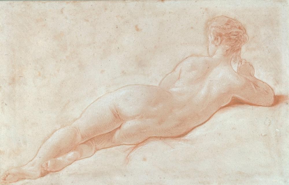 Francois Boucher, Rückenakt einer liegenden Frau (Frau,Kunst,Nymphe,Akt,Rokoko,Po (Gesäss),Rückenakt,Studie,Französische Kunst,Aktstudie,Liegen)