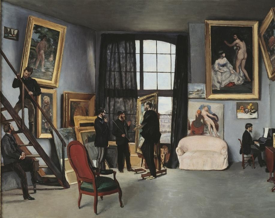 Frederic Bazille, L’atelier de Bazille (Atelier,Besuch,Fenster,Herrenmode,Künstlerleben,Künstler,Maler (Künstler),Möbel,Treppe,Staffelei,Bild Im Bild,Klavier,Interieur,Künstlerhaus (Wohnhaus),Sofa,Französische Kunst,Herrenrunde,Wohlstand,Sessel,Stuhl,Kommunikation,Klapptisch,Klavierspiel,Gesell)