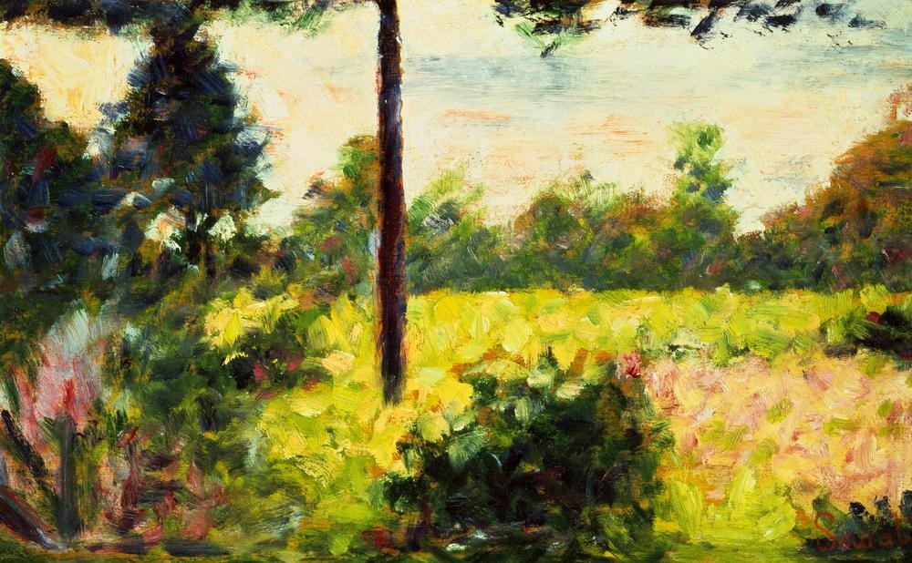 Georges Seurat, Wald bei Barbizon (Landschaft, Wald, Bäume, Pflanzen, Frankreich, Impressionismus,  Klassische Moderne, Wunschgröße, Wohnzimmer, Malerei, bunt)
