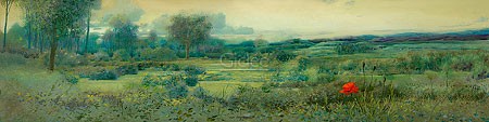 Ger Stallenberg, Redemption (Malerei, Natur, Landschaft, Wiese, Blume, rote Blüte, Dunst, Morgenlicht, Schlafzimmer, Wohnzimmer, bunt)