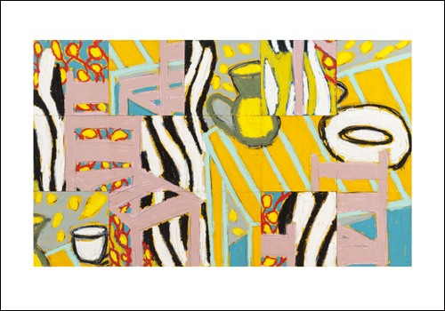 Gordon HOPKINS, Indian Summer, 2009 (Modern, Malerei, abstrakt, flächig - dekorativ, geometrische Muster, Stillleben, Tisch, Krug, Teller, bunt)