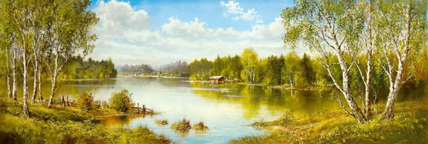 Helmut Glassl, LAKE IN MASUREN I (Malerei, Landschaften, Natur,    Birken, See, Einsamkeit, Idylle, Ruhe, Bäume, Nostalgie, Wohnzimmer, Treppenhaus, Wunschgröße, bunt)