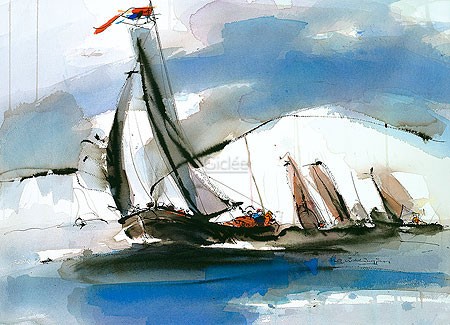 Ingrid Dingjan, Skutsjesilen (Malerei, modern, Schifffahrt, maritim, Segelboote, Reagatta, Wind, Abstraktion, Farbverläufe, Wohnzimmer, Arztpraxis, bunt)