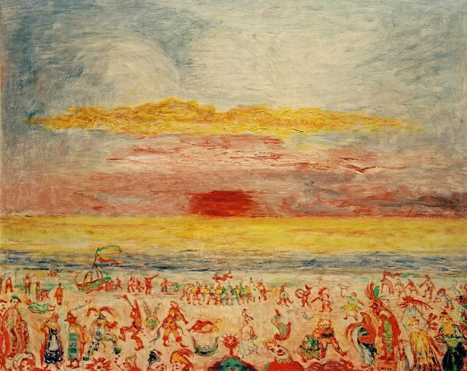 James Ensor, Karneval in Ostende (Brauchtum,Feste,Kalenderfeste,Kunst,Landschaft,Maskerade,Seebad,Sonnenuntergang,Strand,Volksfest,Tageszeiten,Abend,Meer,Symbolismus,Phantastische Kunst,Belgische Kunst,Privatsammlung,Farbigkeit,Karneval,Verkleidung,Signatur,Farbe)