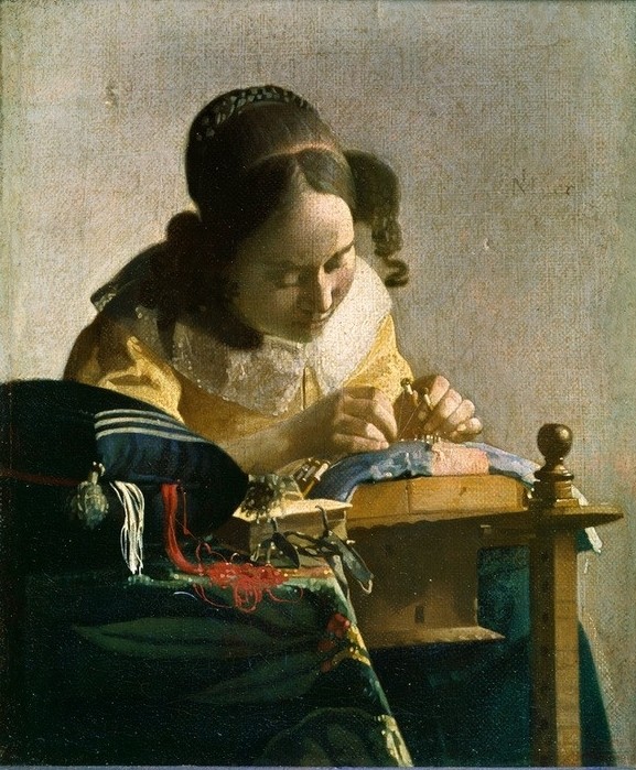 Jan Vermeer, Die Spitzenklöpplerin (Beruf,Frau Und Beruf,Frau,Handarbeit,Handwerk Und Gewerbe,Klöpplerin,Kunst,Spitzenklöpplerin,Barock,Portrait,Genre,Niederländische Kunst,Holländische Kunst,Harmonie,Frauenleben,Berühmte Kunstwerke,Garn,Junge Frau,Konzentration,Klöppelkissen,Klöppelbrief,A)