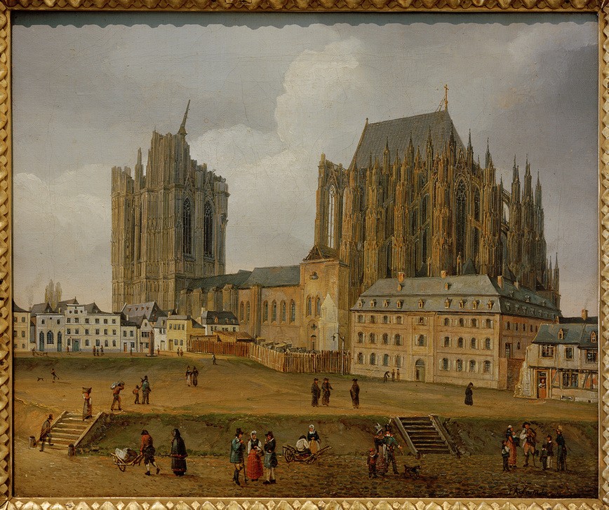 Johann Adolf Lasinsky, Kölner Dom von Südosten (Architektur,Christentum,Deutsche Kunst,Dom,Geographie,Katholische Kirche,Kirche,Kran,Kunst,Religion,Stadt,Gotik,Vedute,Architekturdarstellung,Ansicht,Bauarbeiten,Aussenansicht,Romantik,Topographie,Gesamtansicht,Unvollendet,Weltkulturerbe,Sakralbau,Kathedr)