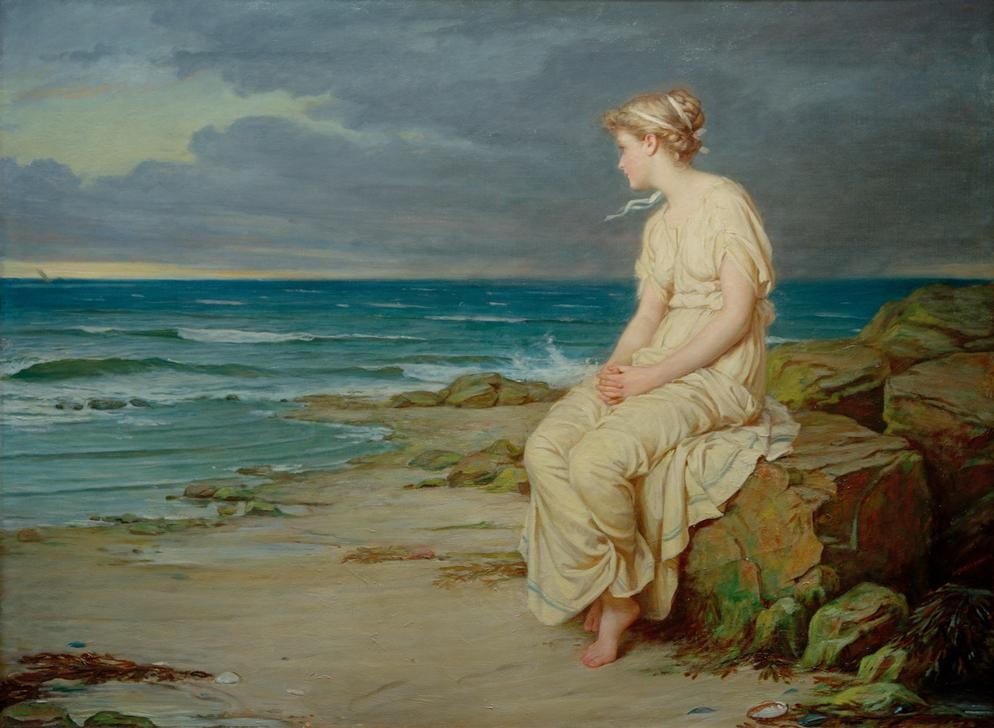 John William Waterhouse, Miranda (Frau,Küste,Kunst,Literatur,Theater,Meer,Präraffaeliten, Schauspiel,Illustration,Junge Frau,Person,  Klassiker, Wunschgröße)