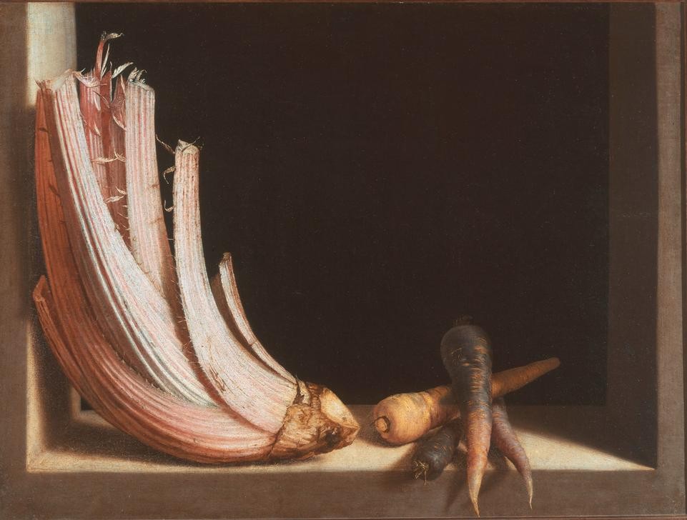 Juan Sanchez Cotan, Gemüsestilleben (Distel,Gemüse,Kunst,Vegetarismus,Barock,Nahrungsmittel,Stillleben,Caravaggisten,Trompe L'oeil,Spanische Kunst,Mohrrübe,Rettich (Botanik),Artischocke,Kardenartischocke)