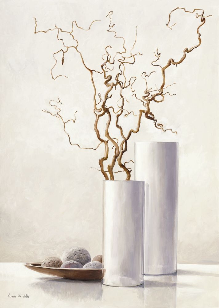 Karin V.D. Valk, Willow Twigs II (Malerei, modern, Stillleben, Blumenvase, verdorrte Zweige, Korkenzieherweide, vertrocknet, Obstteller, steril, kühl, Esszimmer, Wohnzimmer, weiß, beige)