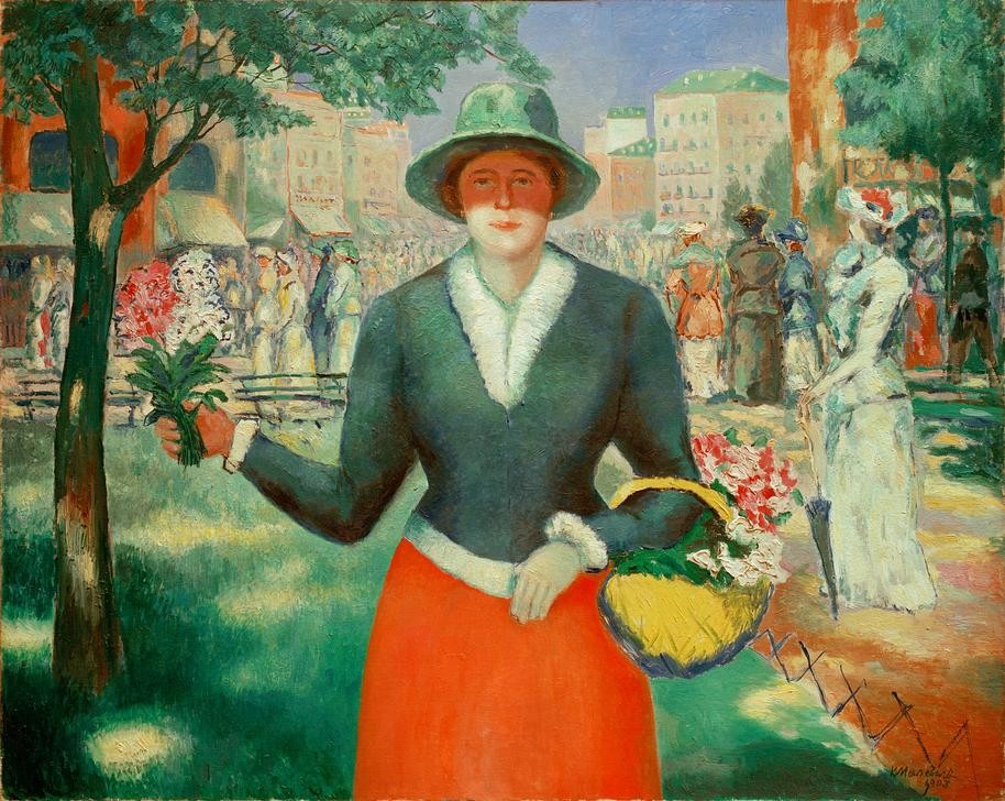Kasimir Malewitsch, Blumenmädchen (Frau Und Beruf,Frau,Handel,Kopfbedeckung,Mode,Strassenhandel,Strassenszene,Szene,Hut,Hand,Gestik,Russische Kunst,Korb,Blumenverkäuferin,Blumenkorb,Blume,Jahrhundertwende)
