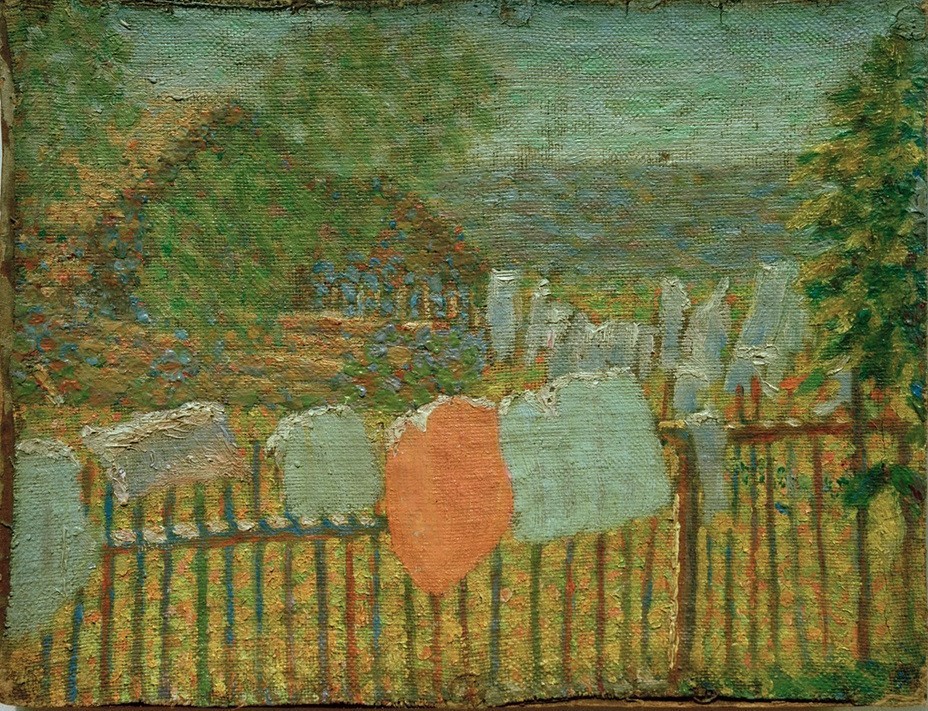 Kasimir Malewitsch, Ohne Titel, um 1904 (Architektur,Bauernhaus,Haus,Kunst,Landschaft,Impressionismus,Zaun,Russische Kunst,Architekturdarstellung,Gartenzaun,Wäsche,Wäscheleine,Ukrainische Kunst,Jahrhundertwende,Wäschetrocknen)