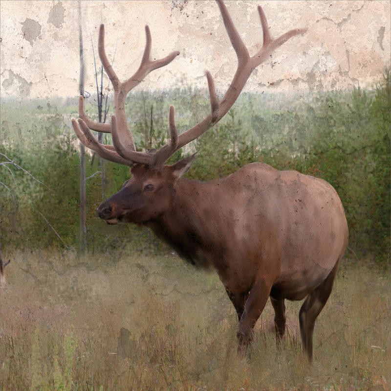 Kimberly Allen, ELK STRIDE (Hirsch, Geweih, Schreiten, majestätisch, Stimmung, Tierportrait, Tier,  zeitgenössisch, Malerei,  Wohnzimmer, Treppenhaus,  Wunschgröße, bunt)
