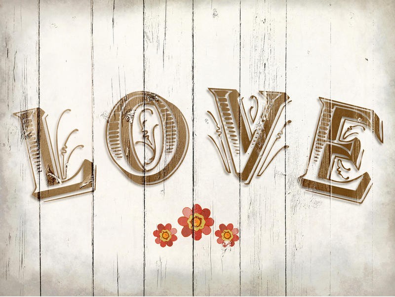 Kimberly Allen, WOOD LOVE I (Motivation, Liebe, Holzpaneele,  Grafik, Typografie, Schriftzug,  Wohnzimmer, Treppenhaus,  Wunschgröße, beige)