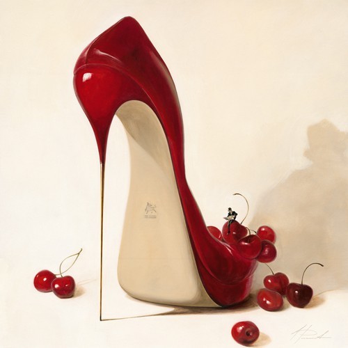 Inna Panasenko, Leinwandbild Cherry Love (Malerei, Schuhe, Stiletto, Kult, Pop,  High Heels, Kirschen, gentleman, Zeitung, Lesender,  Küche, Esszimmer, Wohnzimmer, Bistro, rot / weiß)
