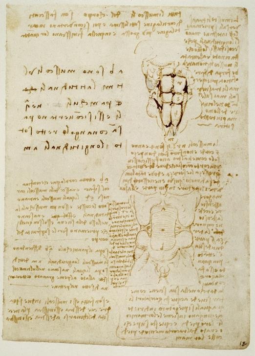 Leonardo da Vinci, Anatomiestudien (Anatomie, Handschrift, Geheimschrift, Spiegelschrift, Mensch, Medizin, Bauchwand, Muskulatur,Naturwissenschaft, Studie, Renaissance, Klassiker, Zeichnung, Wunschgröße, Wohnzimmer, Arztpraxis)