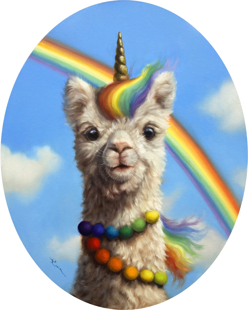 Lucia Heffernan, Unipaca (Alpaca, Regenbogen, Halskette, Einhorn, Freak, Spaß, Grafik,  Antropomorphismus, Wunschgröße, witzig, lustig, komisch, Wohnzimmer, Treppenhaus,  bunt,Comic)