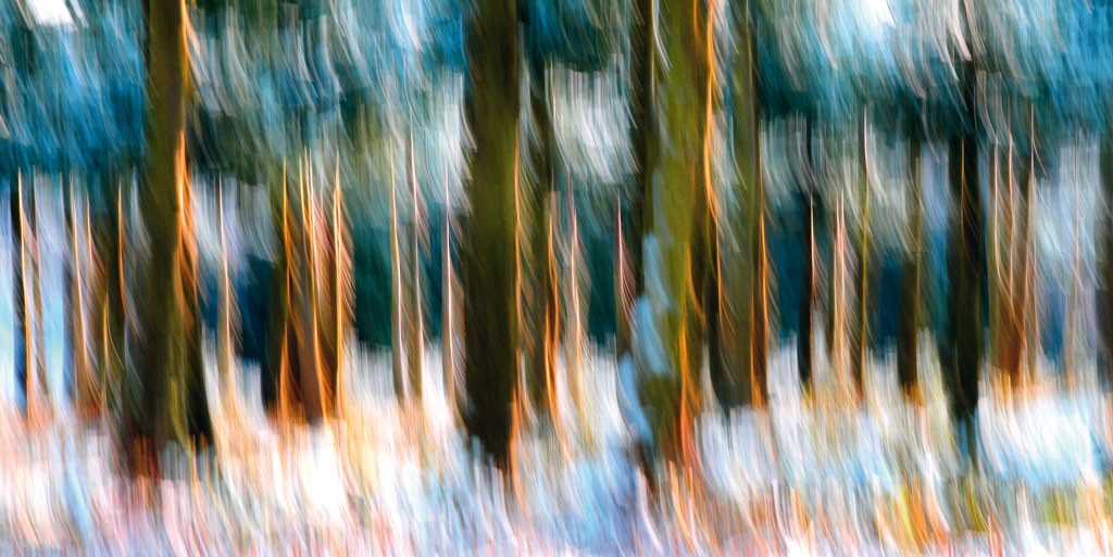 Michael Rateike, Waldzauber 12 (Wald, Bäume, Natur & Landschaft, Fotokunst, verschwommen, diffus, unscharf, Wohnzimmer, Treppenhaus, bunt)