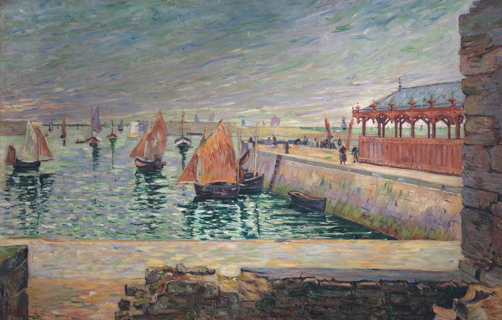 Paul Signac, Der Fischmarkt, Port-en-Bessin (Fischerei,Fischmarkt,Kunst,Markthalle,Impressionismus,Segelboot,Französische Kunst,Fischereihafen,Privatsammlung)