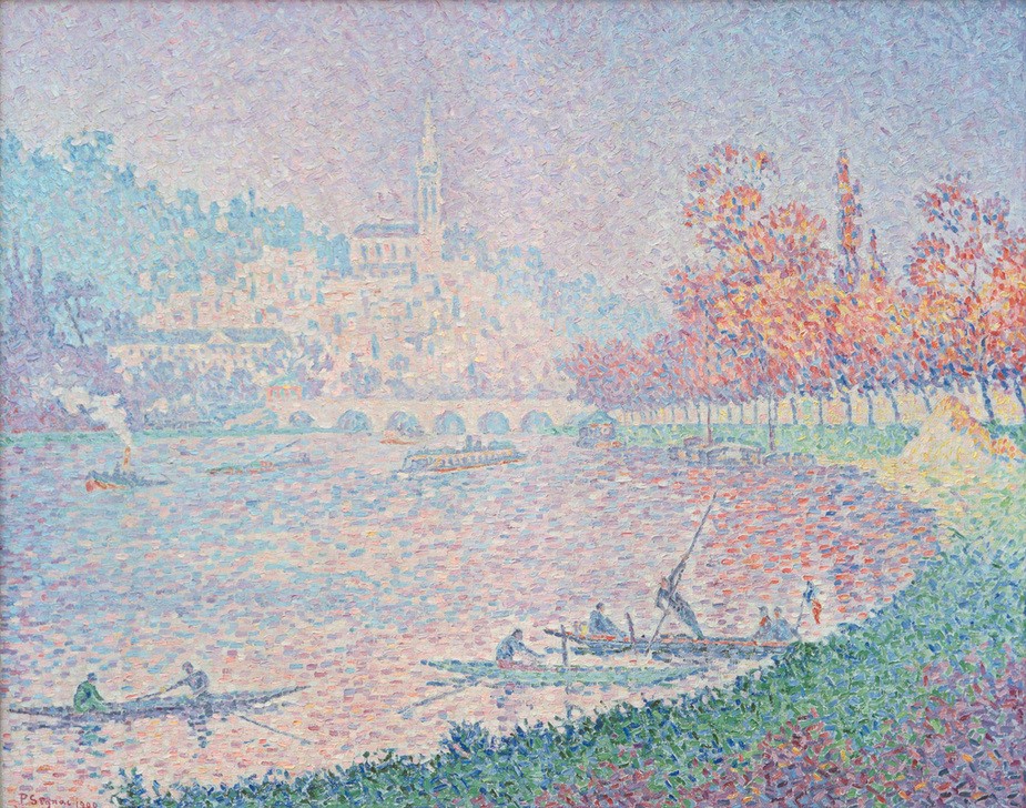 Paul Signac, Saint-Cloud (Die Seine bei Saint-Cloud) (Architektur,Boot,Brücke,Geographie,Kirche,Kunst,Landschaft,Ruderboot,Fluss,Pointillismus,Architekturdarstellung,Französische Kunst,Binnenschiffahrt,Ufer,Ansicht,Jahrhundertwende,Flusschiffahrt,Topographie,Postimpressionismus,Schifffahrt)