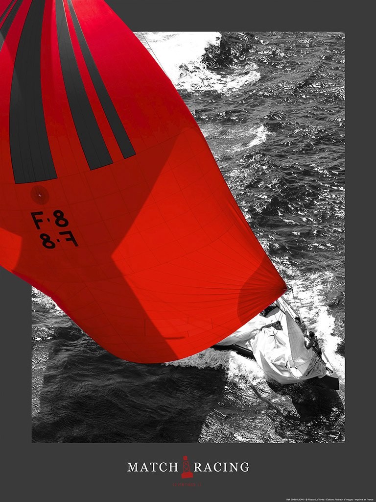 Philip Plisson, 12 MJI (Segelboot, Regatta, match racing, maritim, Segelsport, Meeresbrise, Meer, Colorspot, Treppenhaus, Badezimmer, Wohnzimmer, Photokunst, Fotokunst, schwarz/weiß/rot)