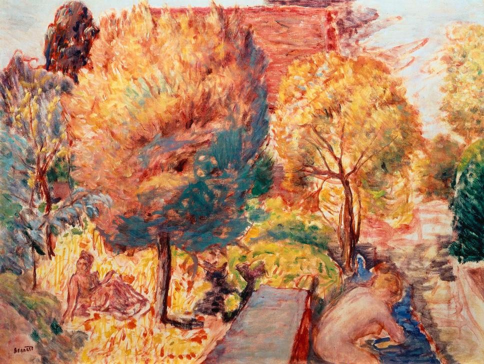 Pierre Bonnard, Landschaft mit Badenden (Malerei, Impressionismus, Landschaft, Bäume, Badende Frauen, Wunschgröße, Treppenhaus, Wohnzimmer, Klassische Moderne, bunt)