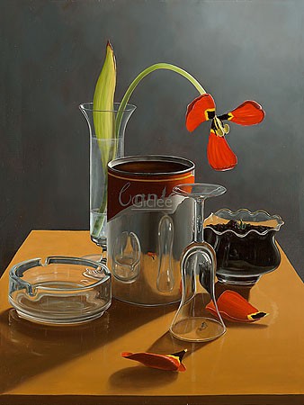 Rob Møhlmann, Canto 80, The procession of the elements, 3 (Malerei, Modern, Stillleben, Tisch, Dose, Aschenbecher, Glas, Schnapsglas, Aschenbecher, Vase, Tulpe, verwelkte Tulpe, Küche, Esszimmer, bunt)
