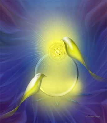 Rosemarie Nikolai-Trischka, Frieden (Licht, göttliches Licht, Paradiesvögel, Vögel, Meditation, innere Mitte, Seelenfrieden, Wellness, Wohlbefinden, Vision, Inspiration, spirituell, religiös, Schlafzimmer, Wohnzimmer, Treppenhaus, Wunschgröße, lila/gelb)