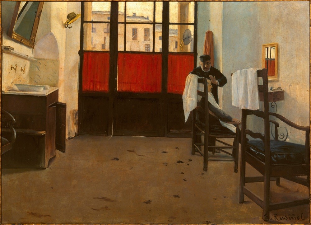 Santiago Rusinol, Der Friseur von Puigcerdà (Barbier,Friseur,Interieur,Spanische Kunst,Innenansicht,Naturalismus,Katalanische Kunst,Malen)