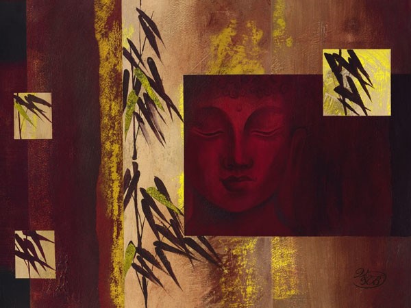 Verbeek & Van den Broek, BUDDHA IV (Wunschgröße, Malerei, modern, Buddha, Statue, Buddhakopf, Buddhismus, Religion, abstrakte Farbfelder, Bambuszweig, Wohnzimmer, Schlafzimmer, Wellness, Treppenhaus, bunt)