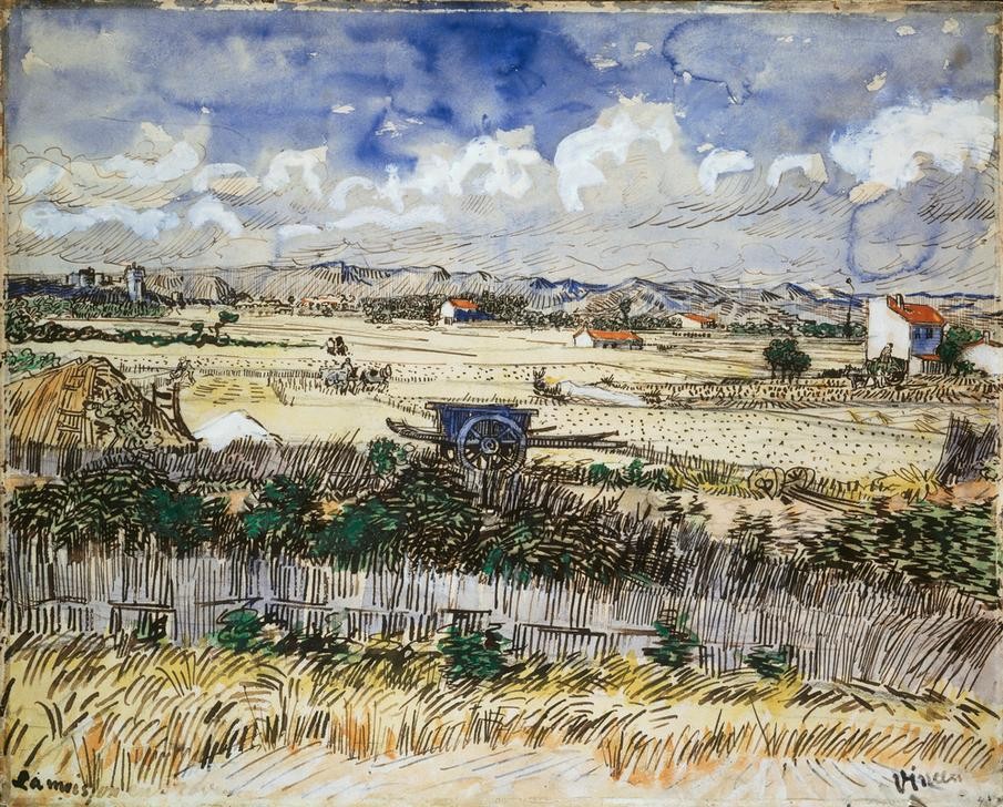 Vincent van Gogh, Blauer Karren (Ackerbau,Bauernhaus,Ernte,Gebirge,Getreideanbau,Haus,Kunst,Landschaft,Impressionismus,Heu,Zaun,Getreide,Scheune,Niederländische Kunst,Feld,Karren,Heuschober,Getreidefeld,Horizont,Berg,Landwirtschaft)