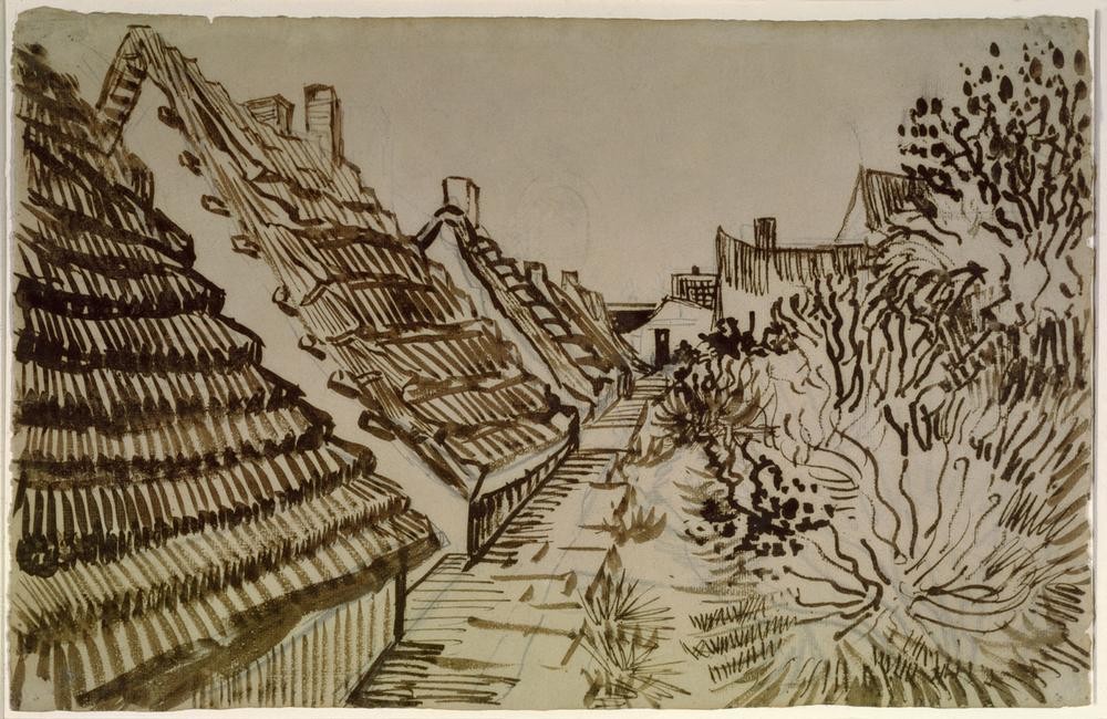 Vincent van Gogh, Mas à Saintes-Maries (Dach,Dorf,Haus,Kunst,Landschaft,Strasse (Allgemein),Hütte,Schornstein,Impressionismus,Architekturdarstellung,Niederländische Kunst,Gasse,Strauch,Kate)